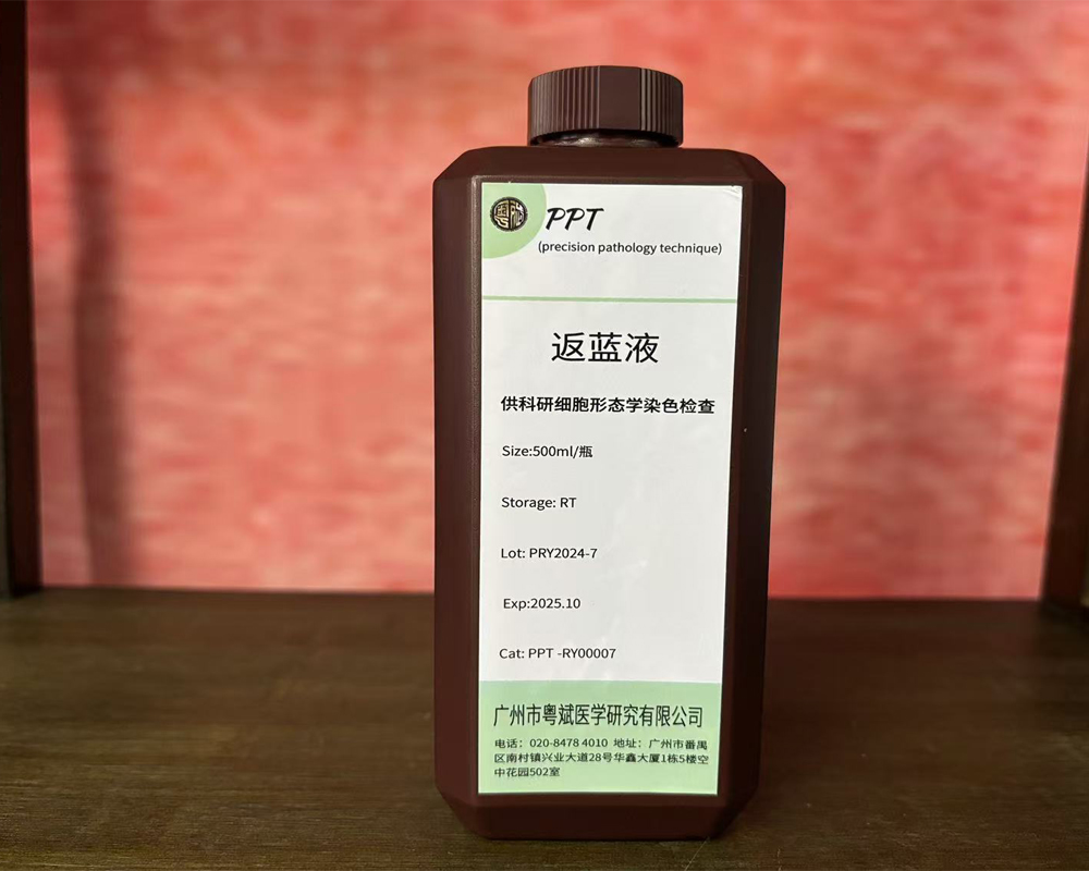 本产品用于HE染色或苏木素染色后的返蓝。苏木素在酸性条件下为离子状态,呈红色;在碱性条件下呈蓝色。组织切片经苏木素染色后,先酸性分化液分化去除过多结合的苏木素,此时苏木素呈红色或粉红色。水洗终止分化,再用弱碱性溶液处理使苏木素呈现蓝色,这个过程就是返蓝作用。HE染色中苏木素染色后的返蓝很重要,使苏木素呈现应有的蓝色。