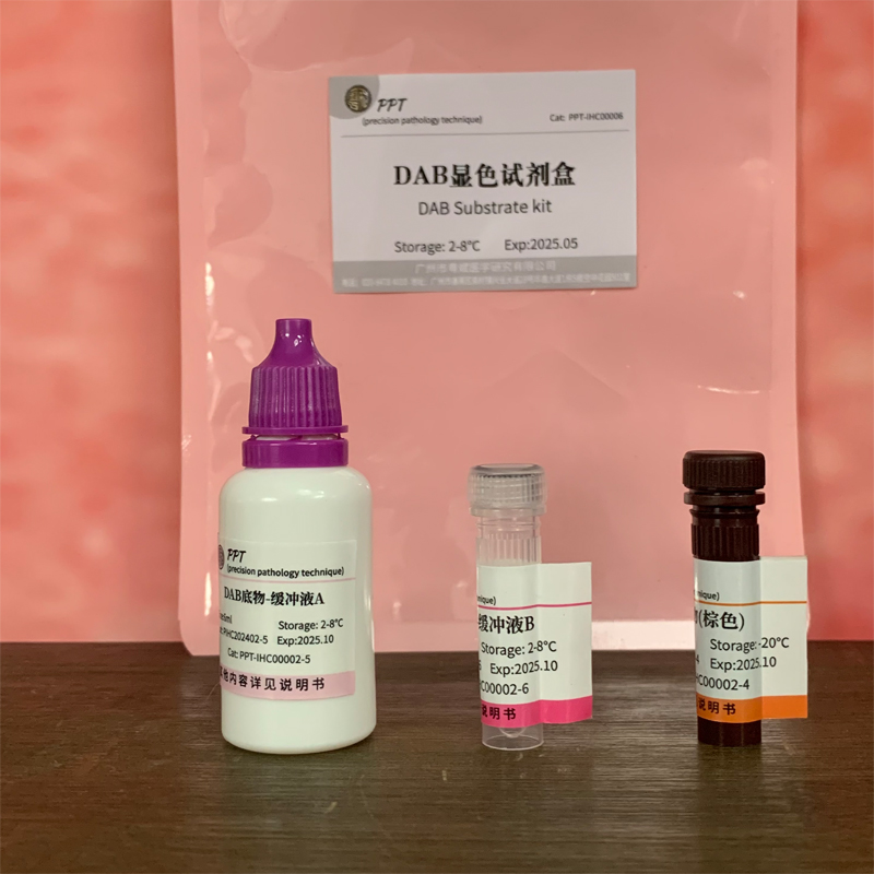 DAB显色试剂盒是借助辣根过氧化物酶(HRP)用于免疫组化显色、原位杂交显色或Western等使用了HRP标记物的样本的显色试剂盒。DAB是辣根过氧化物酶(HRP)的底物,在HRP的催化下,DAB产生棕色沉淀,该沉淀不溶于水和乙醇。因此在DAB显色以后还可以用醇溶染料进行后续染色。用于免疫组化或原位杂交时,按照每个样本使用50 μL显色液,