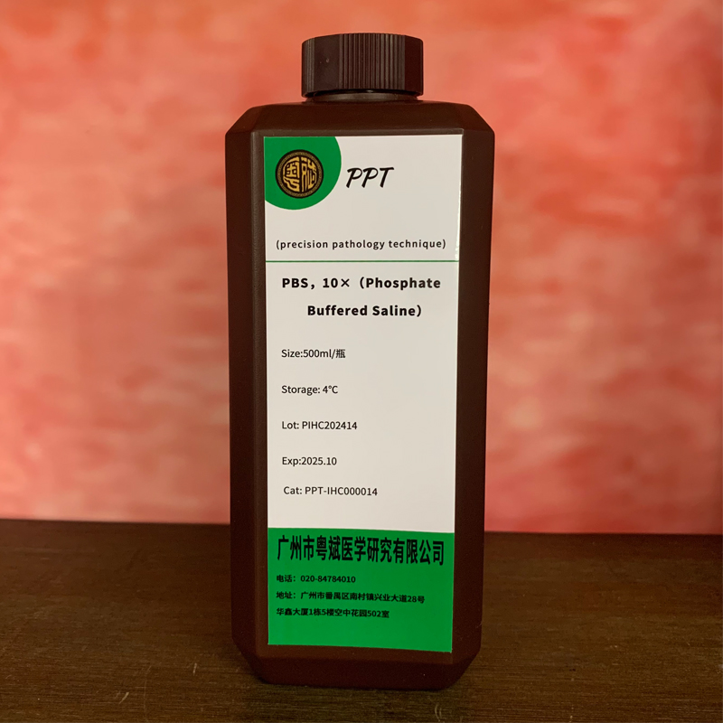 PBS, 10×(Phosphate Buffered Saline),即10倍浓缩的磷酸盐缓冲液,是生物学、生物化学研究中使用较广泛的一种平衡盐溶液,稀释10倍后得到1×PBS磷酸盐缓冲液,可用于组织块的洗涤、细胞的漂洗、其他试剂的配制以及作为细胞计数的稀释液等。