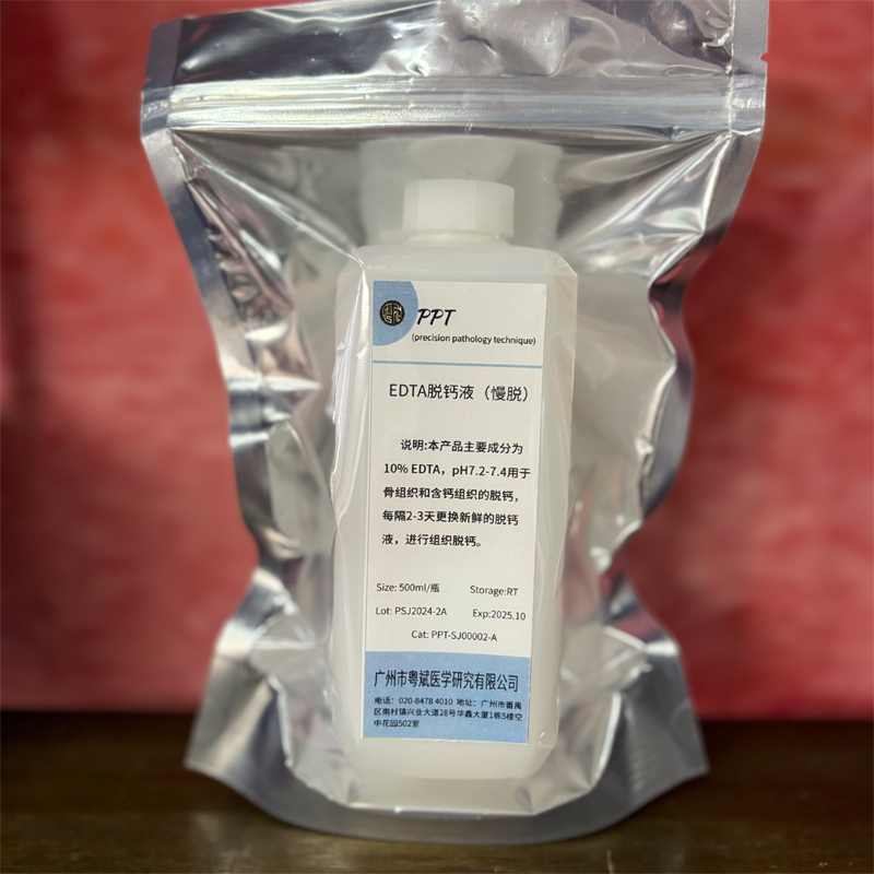 在病理实验中针对骨组织或一些含钙组织制作切片时,由于硬度较大不能直接制作切片,需要脱去钙质使组织变软,方可制成切片。常用脱钙试剂有EDTA、有机酸、无机酸等,其中EDTA是一种较温和的螯合型脱钙剂,可与羟基磷灰石结晶的外层钙结合,形成可溶性的非离子化合物,同时又促进晶体内层的结合钙向外转移。借助这种连续性的作用使羟基磷灰石晶体逐渐融解,pH中性时可起螯合作用。其特点是对组织结构影响最小,可以较好保存组织的某些酶类,经EDTA脱钙后的组织可以进行免疫组化、原位杂交等检测,该法脱钙速度缓慢,脱钙周期长,一般需要数周至数月,与脱钙组织大小有关。