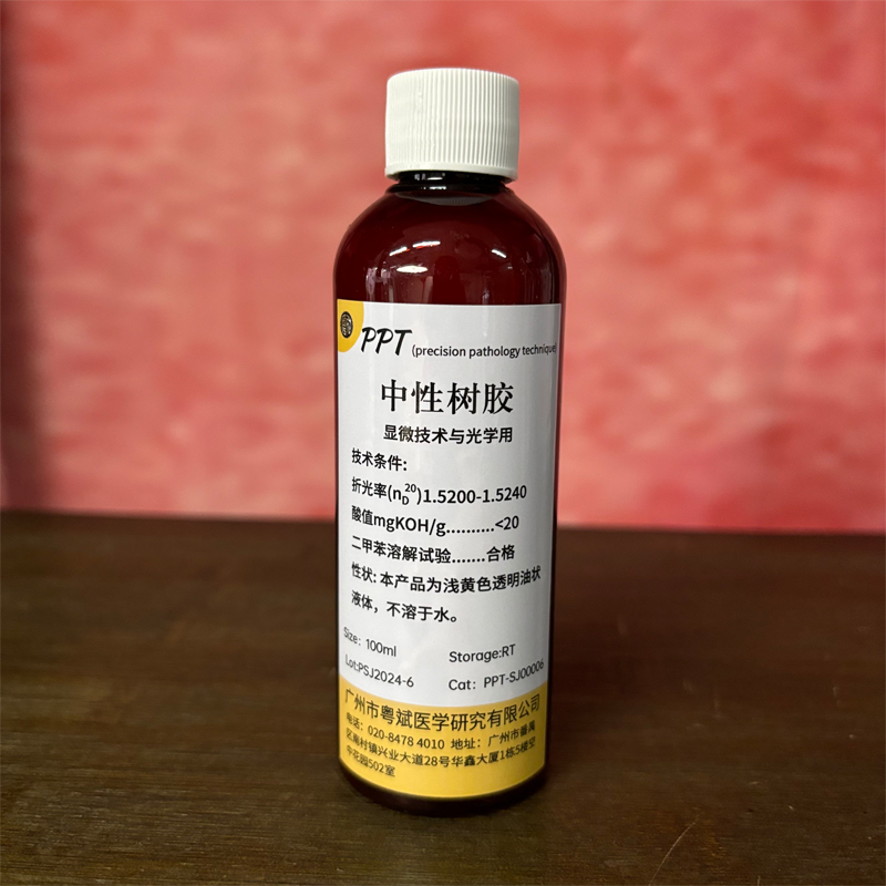 中性树胶,英文名称Rhamsan gum,是一种粘合剂,用于将载玻片和盖玻片粘合在一起,可以将生物组织切片封固长久保留。具有透明度高,不腐蚀玻璃,不容易长霉等特点,且可溶于二甲苯中。